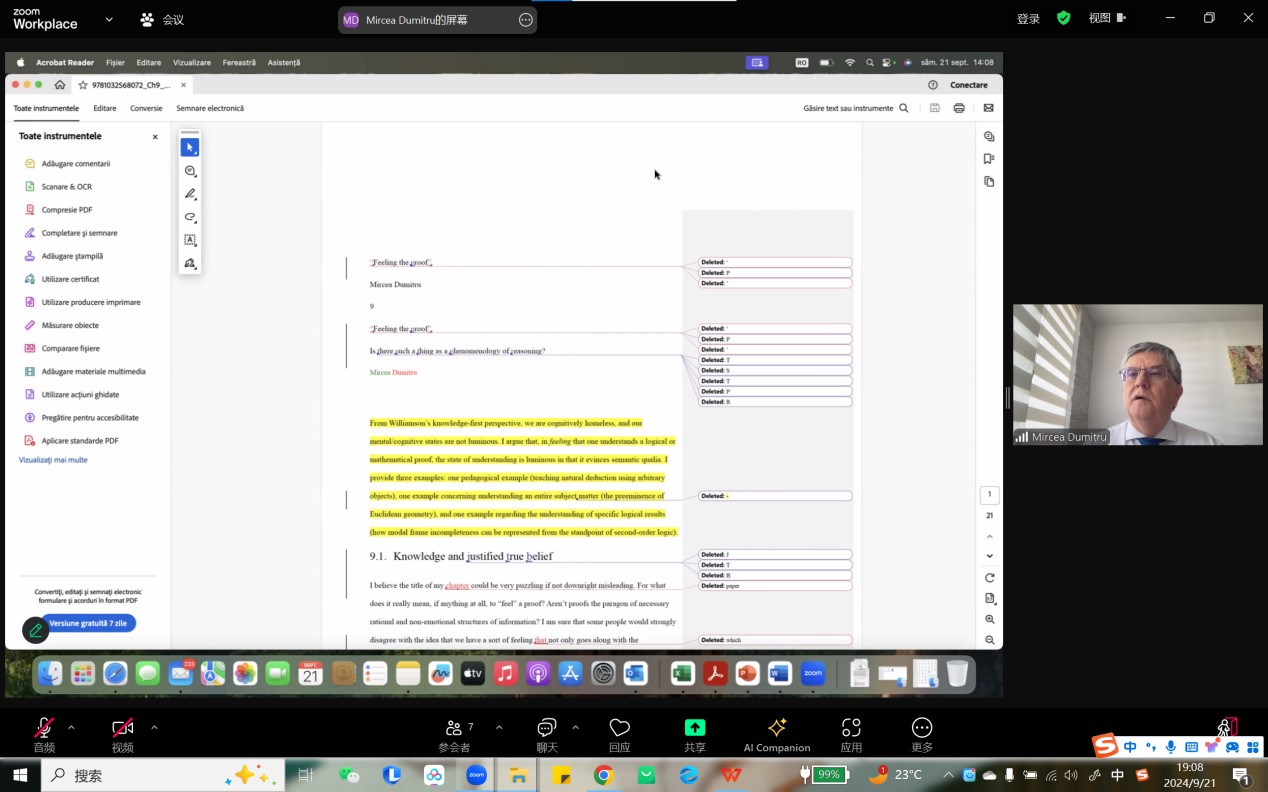 本网讯(通讯员 鲁彦君) 9月21日晚,应色情导航 陈波教授邀请,哲学教授、罗马尼亚科学院副院长、欧洲科学院院士,国际哲学院(IIP)院士及前主席,米尔恰·杜米特鲁(Mircea Dumitru)做题为“‘感受到一个证明’:存在像推理现象学这样的东西吗?”的讲座。讲座由色情导航 程勇教授主持,四川大学哲学系徐召清副教授评议。来自国内外的110余名听众参与本次线上讲座。
