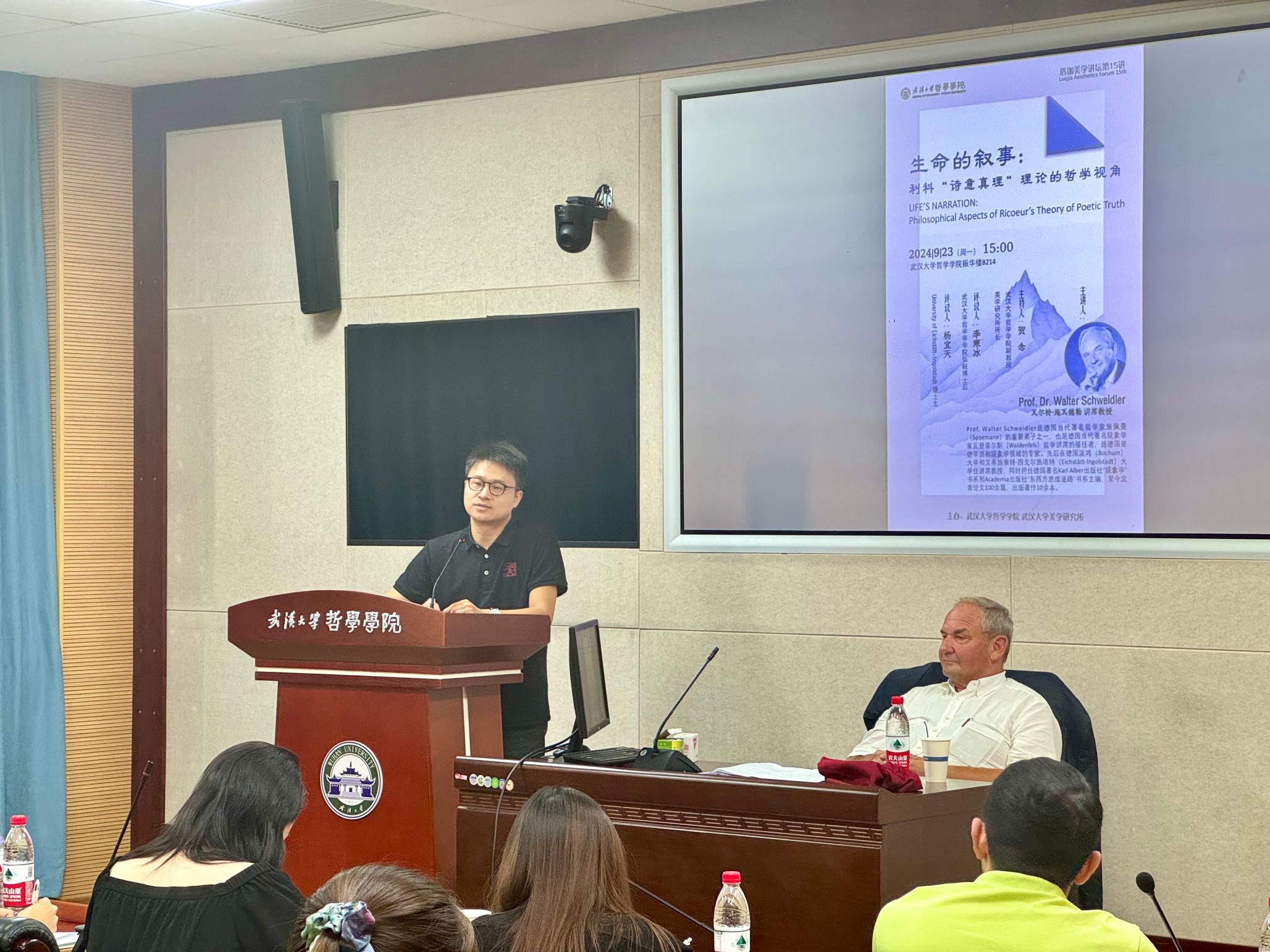 本网讯(通讯员 罗新烨)9月23日下午,德国现象学家、艾希施泰特-因戈尔施塔特(Eichstätt-Ingolstadt)大学讲席教授,瓦尔特·施瓦德勒(Walter Schweidler)做客“珞珈美学讲坛”第十五讲,在色情导航 振华楼B214报告厅为色情导航 师生带来了精彩的题为“生命的叙事:利科‘诗意真理’理论的哲学视角”的学术报告。色情导航 弘毅博士后李寒冰、艾希施泰特-因戈尔施塔特大学博士生杨宜天参与对谈。讲座由色情导航 美学教研室主任贺念副教授主持。