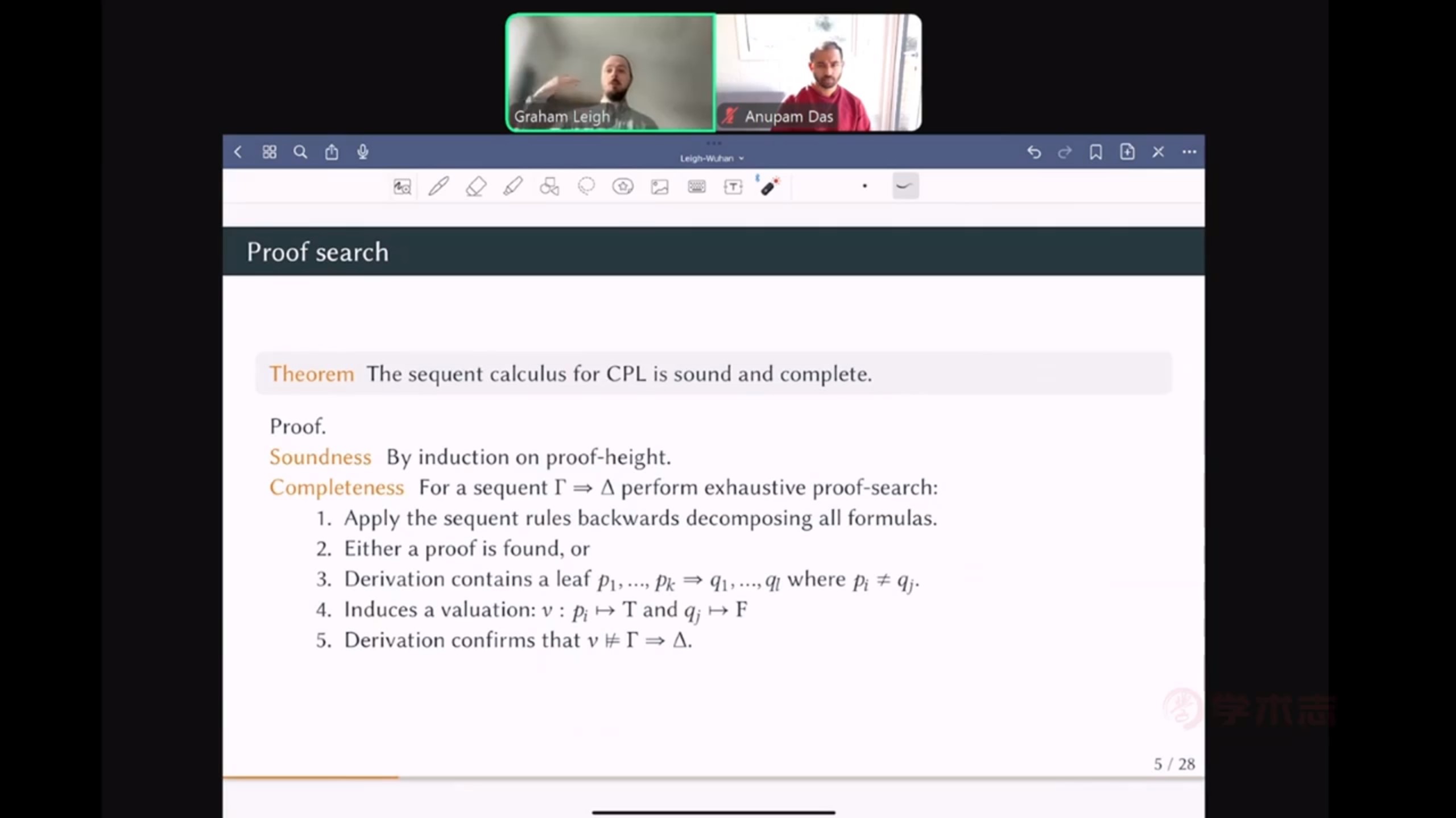 在讲座的讨论环节,Anupam Das教授就这一领域许多未解问题的技术细节,如归纳定义的理论和高阶逻辑的劣基证明论,和Leigh教授进行了广泛深入地交流。荷兰莱顿大学的Göran Sundholm教授就ω算术的证明搜索向Leigh教授分享了看法,程勇教授就哥德尔第二不完全性定理的一个推论——不存在有穷的无切割的矢列演算系统刻画PA与Leigh教授进行了讨论。此外,线上的观众则就原始递归算术和WKL0的强度比较及逻辑学家Gentzen关于PA的一致性证明和这里提到的一致性证明的关联和Leigh教授进行了交流。