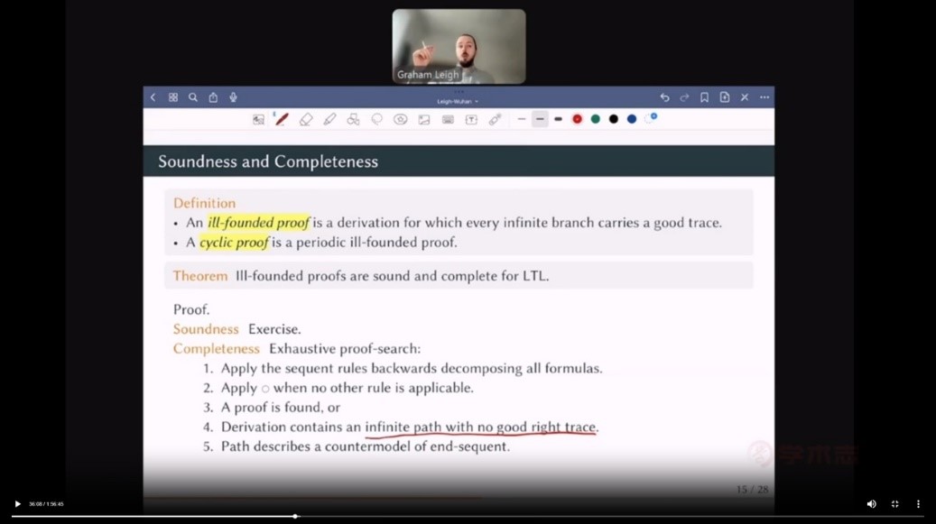 讲座的第二部分是余-归纳(co-inductive)证明论。劣基证明(ill-founded proof)的概念很自然地出现在不同的逻辑和理论系统中,如线性时态逻辑和皮亚诺算术中。这类证明具有很好的性质:证明变换是连续的;证明的复杂性而非大小是其主要指标;便于系统的模块化分析。Leigh教授以线性时态逻辑和皮亚诺算术为例对其进行了介绍。线性时态逻辑有两类算子:表示命题从现在开始一直为真的算子和表示命题在下一个时刻为真的算子。通过对一个典型的线性时态逻辑证明搜索的分析,Leigh教授引入了迹(trace)和优迹(good trace)的概念,进而形式地定义了劣基证明和循环证明。通过证明搜索的方法可以证明线性时态逻辑的劣基证明系统是可靠且完全的,通过证明变换的方法可以证明切割规则在线性时态逻辑的递归可允许性。另一个重要的例子则是皮亚诺算术PA。皮亚诺算术的矢列演算系统是在CPL的基础上添加量词规则、等词规则和归纳规则、切割规则扩展而成的。通过对更强的