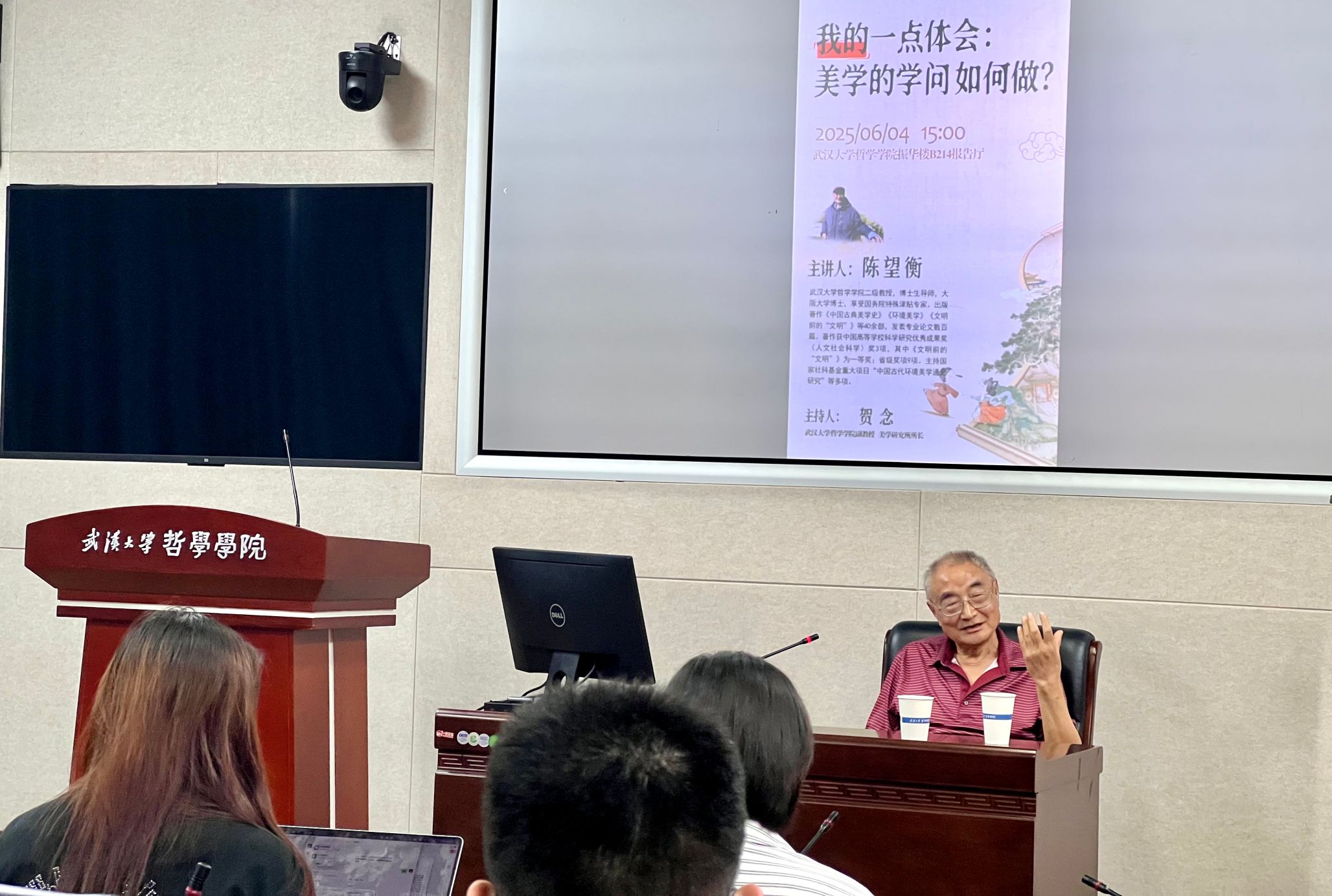 讲座结束之际,贺念副教授简要总结了整场讲座的主要内容,对陈望衡教授的精彩讲座表示衷心感谢,并鼓励同学们在未来的治学之路上以珞珈美学先辈为榜样,将珞珈美学近百年的学问传统发扬光大。