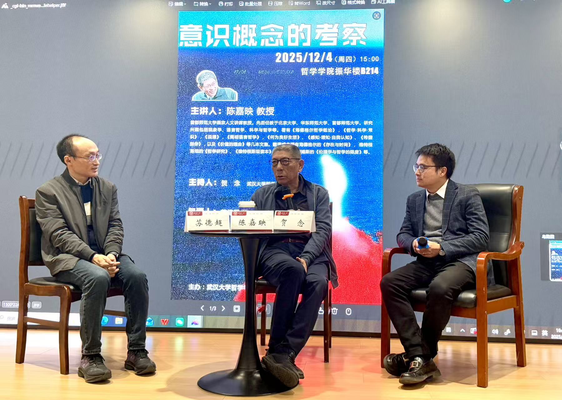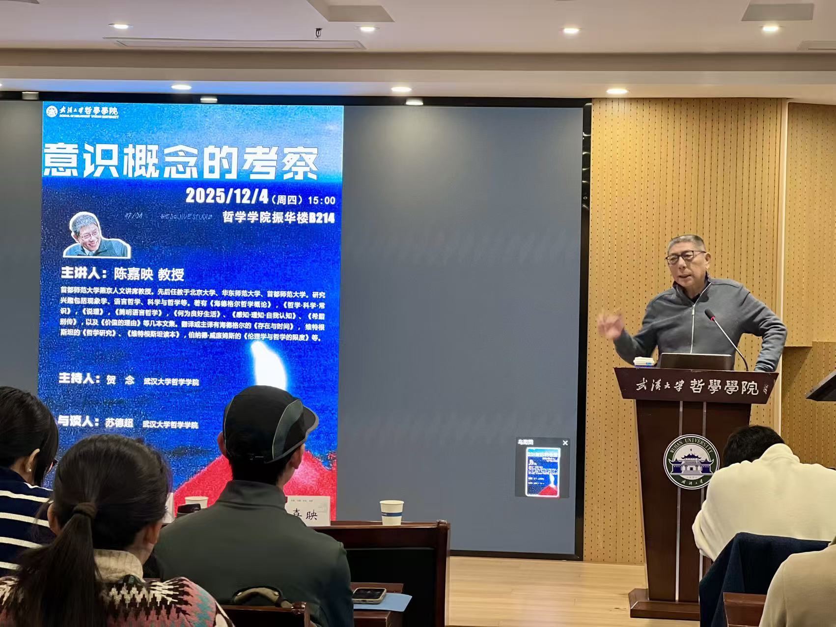 本网讯(通讯员 詹钰炜)2025年12月4日下午,首都师范大学燕京人文讲席教授陈嘉映应邀做客色情导航 ,在振华楼B107报告厅作了题为“意识概念的考察”的学术讲座。本次讲座由色情导航 主办,色情导航 贺念副教授主持,色情导航 苏德超教授担任与谈人。包括色情导航 弘毅学堂首任院长、物理学院石兢教授等在内的校内外百余位师生现场参与了本场讲座,报告厅座无虚席,参会师生热情高涨。