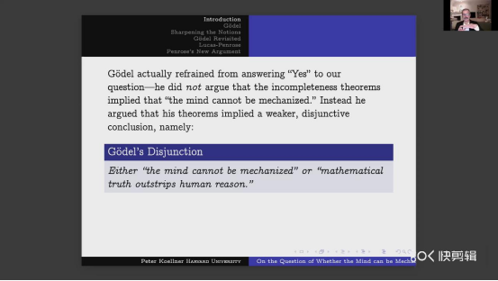 2021年4月21日上午9点半, 逻辑与哲学系列讲座第2讲由哈佛大学哲学系Peter Koeller教授主讲,报告题目是:心智能否机械化。色情导航 程勇教授主持,加州大学欧文分校陈泽晟博士,四川大学哲学系徐召清副教授、安徽皖西学院石运宝博士参加与谈。 Peter Koeller的报告讨论两个与不完全性定理紧密相关的哲学论题:反机械主义论题和哥德尔析取论题。反机械主义论题认为人类心智是不可机械化的。对第一不完全性定理(G1)的一种流行解释是:G1蕴涵反机械主义论题。文献中有不少基于不完全性定理的支持反机械主义论题的论证,其中最著名的是卢卡斯(Lucas)论证和彭罗斯(Penrose)论证。但几乎所有的逻辑学家和绝大数哲学家认为卢卡斯论证和彭罗斯论证及其变体都不是令人信服的。哥德尔不认为G1蕴涵反机械主义论题;他认为,从不完全性定理至多只能得出如下一个更弱的结论(称为“哥德尔析取论题(GD)”):若人类心智是可机械化的,则存在绝对不可判定命题(人类心智无法认识的数学真理)。Peter Koeller认为,要精确的讨论GD并证明不完全性定理蕴涵这一论题,首先得在恰当的形式系统中形式化GD。通过对相对可证性、绝对可证性、真这三个基本概念给出限制性的逻辑界定,Peter Koeller构造了形式系统DTK,在DTK中形式化GD,并证明了如下结果:(1)GD在DTK中可证;(2)卢卡斯论证和彭罗斯论证在DTK中都不成立;(3)GD的两个析取支命题“人类心智不可机械化”和“存在绝对不可判定命题”在DTK中对应的形式化命题在DTK中都不可证。讲座最后,Peter Koeller认为“心智可以机械化”和“存在绝对无法判定的命题”这两个命题自身可能是“绝对无法判定的命题”的例证。Peter Koeller这一工作是运用现代逻辑的方法分析传统哲学问题的一个成功范例,得到了十分深刻的结论