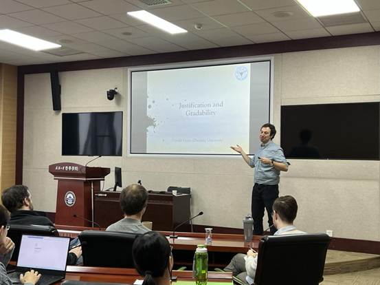 第一场讲座由浙江大学的Davide Fassio教授主讲,题为“辩护与可分级性”。Davide Fassio认为语言学径路对justified一词的可分级性分析有助于澄清知识论中其他概念与justification(辩护)的关系。他指出当前许多学者都认为对justified一词在知识论领域上的使用也可以通过标准的分级测试,但是对justified是相对等级形容词(如tall、big、expensive)还是绝对等级形容词(如open、full、opaque)存在争议。在给出了语言学中关于等级形容词(gradable adjectives)的类型划分之后,结合与其他形容词的类比和美国当代英语语料库中justified的使用实例,他的大多数测试结果表明justified是绝对等级形容词而非相对等级形容词。讲座的最后,Davide Fassio认为,单纯从可分级性的眼光来看,知识论中已有的某些用于刻画justification的相关概念,如理性的、语境主义的、概率论的,不足以充分捕捉到justified作为绝对等级形容词的性质。