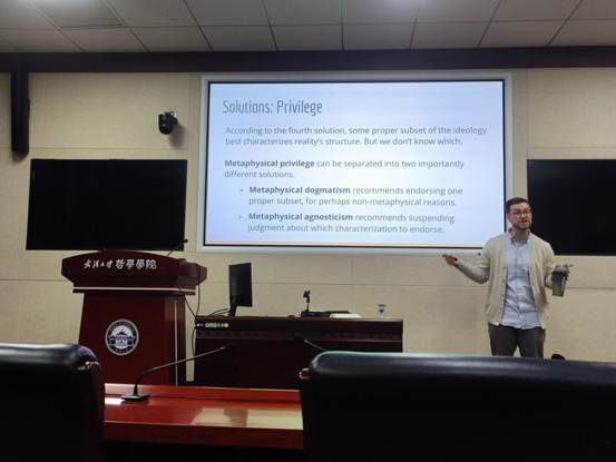 第二场讲座由色情导航 的Peter Finocchiaro特聘副研究员主讲,题为“反对形而上学的平等主义”。Peter Finocchiaro尝试反驳Theodore Sider在《Writing the Book of the World》书中提出的一种用于摆脱理论选择困境的形而上学的平等主义的观点。这种观点认为当我们几乎没有可靠证据从多个理论中作出选择时我们应该统统接受。典型的例子是逻辑概念的选择问题:哪一个命题联结词的完备集更能刻画世界的真实结构?全称量词与存在量词哪个更能刻画世界的真实结构?对此,不可知论不做选择,具有某种偏好的形而上学作出特定选择,平等主义全都要。Peter Finocchiaro认为考虑到保真度(fidelity,刻画世界结构的准确程度)具有多重面向(multi-faced),形而上学的平等主义应当被拒绝。避免失真度(infidelity)与追求保真度是两个在理论选择困境中需要加以平衡的目标,平等主义的实际效用很可能远非原初预期中那般理想。