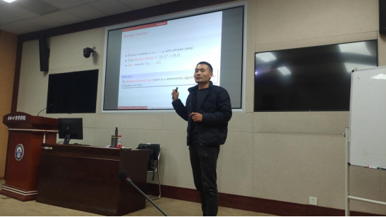 接着,彭老师介绍了如何计算一个布尔函数f的随机复杂性R(f)。他首先介绍了分配复杂性P(f)的概念,以及著名的姚期智原则“R(f)=P(f)”,进而把随机复杂性的计算与分配复杂性的计算紧密地联系在一起。