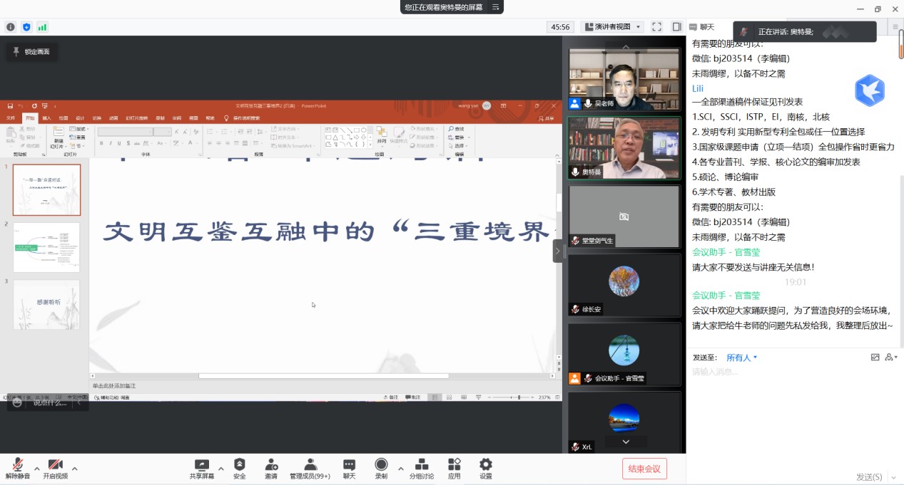 吴根友教授对牛汝极教授的演讲作总结中指出,在文明交流中应保持文化多元的态势,进而在互融互鉴的过程中保持文化的创新活力。在互动环节中,与会师生与牛教授进行了热烈的讨论交流,其中,有听众提问中国应输出何种文化,牛汝极教授认为,在中华文化和东方哲学中,“天人合一”的思想和人文的终极关怀值得向外输出。