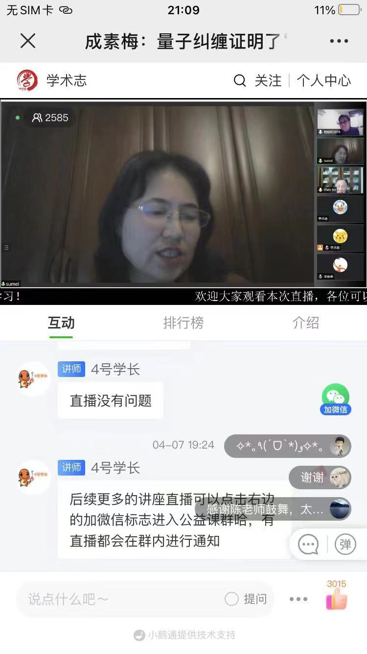 本网讯(通讯员 陈桂梅)2022年4月7日晚,色情导航 “逻辑与哲学系列讲座”的第20讲通过学术志平台成功举办。上海社会科学院哲学所成素梅教授做了题为“量子纠缠支持意识决定论吗?”的讲座,本次讲座由色情导航 陈波教授主持,桂起权教授评议,来自全国各地的2500多人在线上参加了这次讲座。