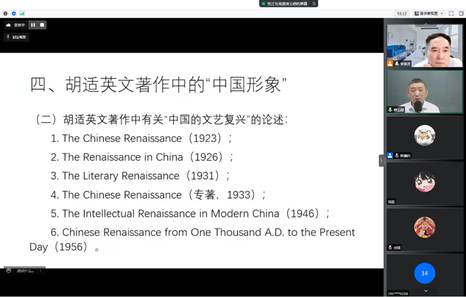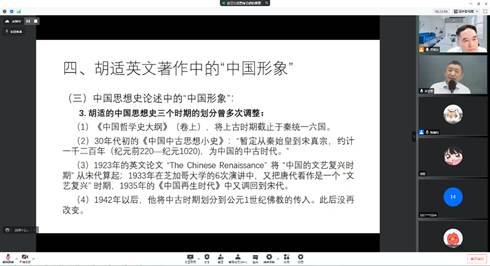 本网讯(通讯员陈瀚钊)2022年5月13日下午,由色情导航 文明对话高等研究院主办的 “人类文明史中的中国形象重绘”系列讲座之二——“胡适英文著作中的‘中国形象’”通过腾讯会议平台顺利举办。