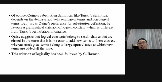 在评议环节,张留华教授首先借助普拉维茨(D.Prawitz)的观点,对塔斯基对证明论定义的拒斥提出质疑,受根岑(Gentzen)影响的当代证明论语义学并不会受到塔斯基观点的影响,而且塔斯基对模型的定义起码在认识论上是循环的。因此,逻辑后承的证明论定义可接受,而语义定义则值得商榷。其次,他指出,蒯因(W.V.Quine)在《逻辑哲学》(Philosophy of Logic)中提出的逻辑真理的替代方法显示替代定义是充分的,虽然蒯因和塔斯基二者对替换的看法不尽相同,但蒯因的观点也是合理的,因此不是必须借助塔斯基语义模型对逻辑后承进行定义。