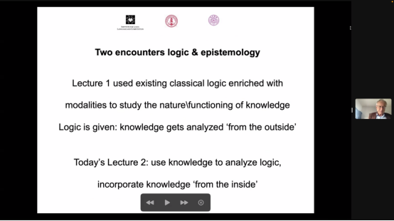 范本特姆教授首先提出,第一讲厘清了信息更新是语义范围的缩小或扩大的概念,强调认知行动在认知逻辑中的重要地位,但并未对逻辑推理与知识和信息更新之间的关系做进一步讨论。有效的推论如何能够提供信息、是否能够提供信息这样简单的问题,始终没有能达成共识的答案。因此本次讲座将首先对动态认知逻辑本身的推理、证明和逻辑后承概念进行说明,展示逻辑后承本身的认识论含义,揭示逻辑-哲学交叉中的显性和隐性立场,最终得出认识论(哲学)和逻辑的交叉可以提供丰富研究素材的结论。