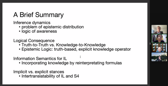 范本特姆教授最后总结到,截至目前,我们讨论了两种不同的认知逻辑,其一是建立在以真为基础的经典命题逻辑之上,添加新的认知算子,厘清知识和其他认识论概念的认知逻辑,这可被称为逻辑与哲学交叉的显性立场。其二是放弃对真的坚持,从知识或信息的角度出发构建的认知逻辑。他强调,从知识或信息的角度出发的认知逻辑更接近逻辑的核心,也更为隐蔽。这被称为逻辑与哲学交叉的隐性立场。这两种出于不同立场的逻辑通常是可互译的。例如从直觉主义逻辑到S4逻辑的哥德尔翻译。无论我们的立场如何,都可以得出认识论(哲学)和逻辑的交叉可以提供丰富的研究素材的结论。