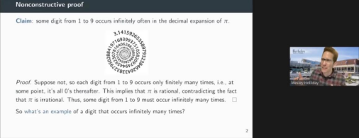 首先,霍利迪讨论了经典逻辑在数学和科学领域面临的挑战。在数学领域,他以圆周率π为例来说明数学中的“非构造性证明”(nonconstructive proof)。运用归谬原则论证在π的十进制展开形式中,1到9中的某个数字会无限次出现。但这个证明并没有告诉我们究竟哪个数字会无限次出现。这样的证明被称为非构造性证明,其特征是虽然证明了存在着某物具有特定的性质,但是我们还没有构造出一个例子并证明它具有这种性质。非构造性证明遭到直觉主义逻辑拥护者的拒斥。他们认为,如果可以证明
