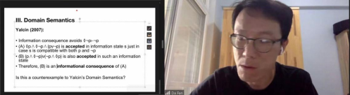在评议环节,樊达围绕着“如何理解‘即使在证明中已经有◇p,但在子证明中也不能使用重述原则得到◇p’” 、“如何理解在包含模态词的自然推理中使用的否定后件原则(MT)”、“领域语义学(Domain Semantics)中对◇¬p├¬p的解释”等问题进行提问。霍利迪回应称,自己会在下次讲座中详细地阐述重述原则,解释为什么即使在证明中已经确定有◇p,但在接下来的子证明不能使用重述原则。对于否定后件原则,霍利迪认为对于包含模态词的语句,存在着前提为真而结论为假的反例。