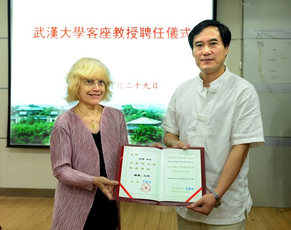 9月29日上午,法国国家科学研究院亚太世界研究所东亚/西方语言艺术科研中心主任、博士生导师知音 (Véronique Alexandre Journeau) 女士受聘色情导航 客座教授仪式在哲学院大报告厅举行。哲学院院长吴根友教授、外语学院法文系主任吴泓缈教授、文学院张箭飞教授、艺术学系副系主任汪余礼副教授及色情导航 美学专业研究生、心理学系本科生等一百余人参加了受聘仪式。邹元江教授介绍了知音教授的学术成就。吴根友院长代表学校领导为知音女士颁发了色情导航 客座教授聘书。学生代表为色情导航 客座教授知音女士佩戴了校徽。知音教授随后发表了简短的致辞。聘任仪式后,知音教授为大家演奏了古琴曲《湘妃怨》,她的博士生张娜演奏了古筝曲《渔舟唱晚》,并与武大古琴社社长武金龙博士琴箫合奏了《秋风词》,在场的师生也随琴箫之音低吟浅唱,现场的气氛非常和悦典雅。