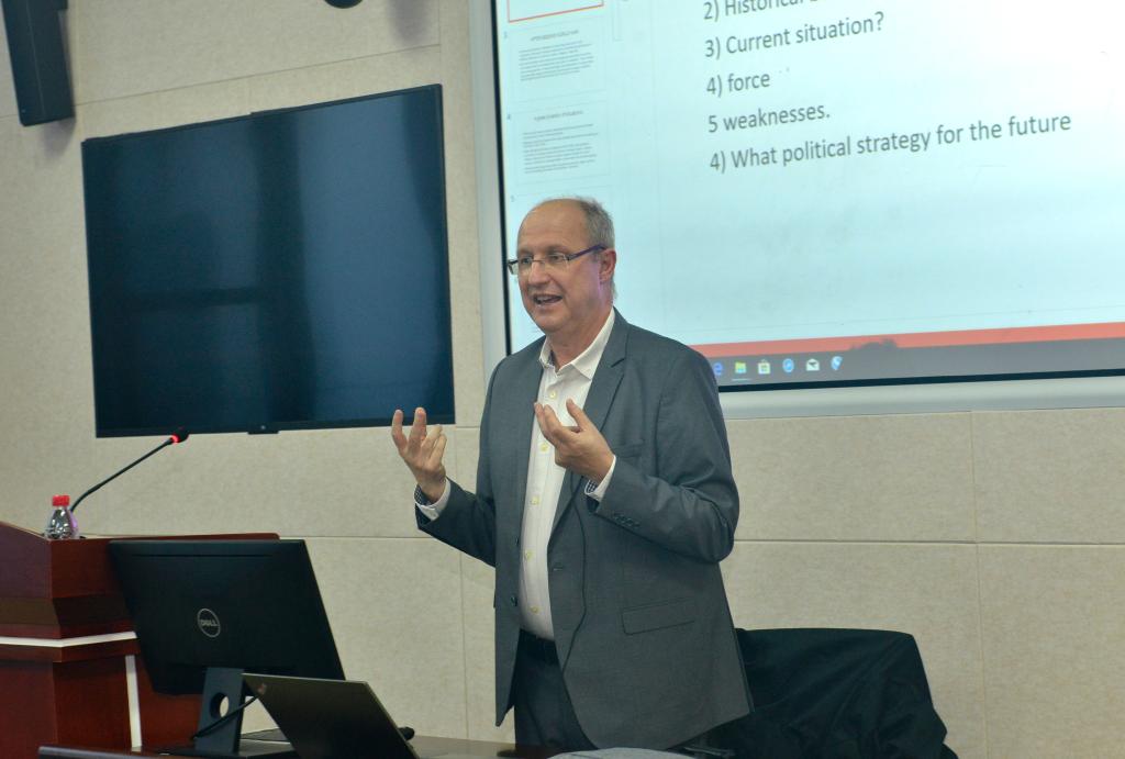 本网讯(通讯员:张萌)2018年11月9日,应色情导航 邀请,比利时法语布鲁塞尔自由大学(ULB)前副校长、政治学与社会学学院院长Jean-Michel DE WAELE教授来色情导航 访问交流。晚上19:30,Jean-Michel DE WAELE教授在色情导航 B214做了题为“当代欧洲激进左派的力量与困难”的讲座。讲座由何萍教授主持,来自色情导航 师生共30余人参加了此次讲座。