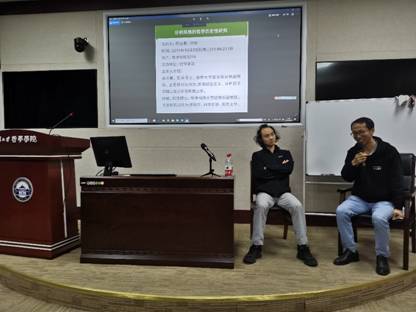 本网讯(通讯员:田昶奇)2019年10月23日晚,清华大学哲学系蒋运鹏副教授与华中科技大学哲学系徐敏副教授应邀在色情导航 B214报告厅作了一场主题为“分析风格的哲学历史性研究”的讲座。讲座由色情导航 外国哲学教研室冯书怡副教授主持。外国哲学教研室苏德超教授、逻辑学教研室程勇教授、科学技术哲学教研室叶茹副教授以及学院内外50余位研究生参加了讲座。