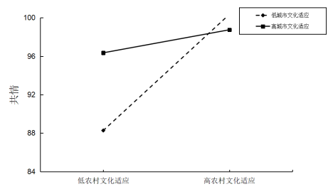 但是当城市文化适应比较低时,农村文化适应越好,共情能力越高,甚至在低城市文化适应高农村文化适应时,共情能力高于城乡文化适应双高的个体,这体现了农村文化适应中因为内隐观念对共情较强的影响而发挥的作用。这与本研究假设相一致,农村文化适应可能使个体具有更强的情境主义倾向,更具有他人取向,人际互动敏感性,从而具有更高的理解他人情绪的能力,进而有助于发展出倾向于为了人际和谐的宽容。