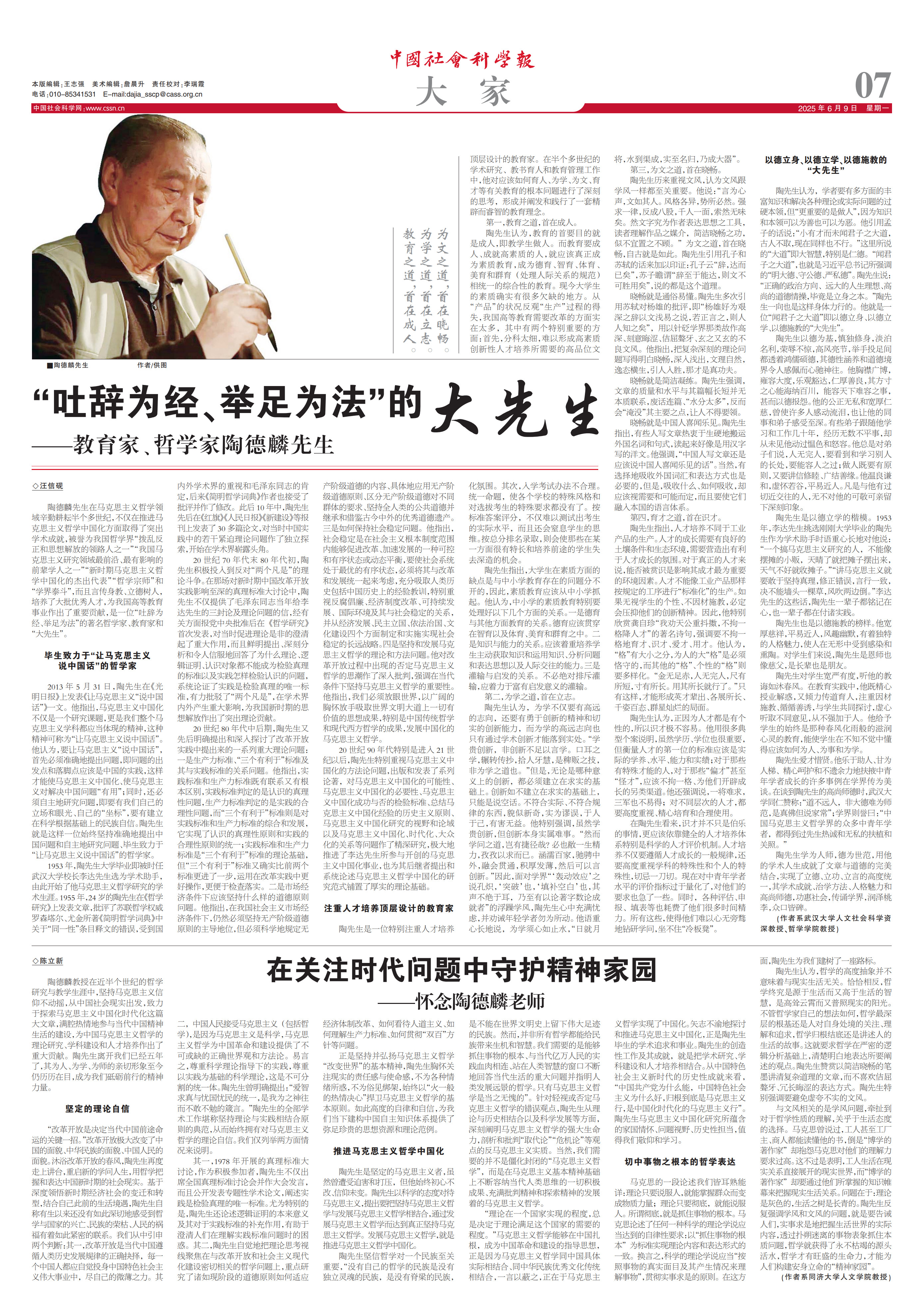 【中国社会科学网】汪信砚|“吐辞为经、举足为法”的大先生——教育家、哲学家陶德麟先生