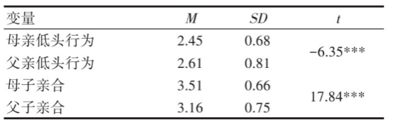 分别对父亲和母亲低头行为、父子和母子亲合进行配对样本t检验,结果表明(见表1):初中生母亲低头行为得分显著低于父亲低头行为,母子亲合得分显著高于父子亲合。
