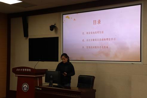 代丹妮老师认真听取学生党支部书记的述职汇报,代表学院对各学生党支部书记一年以来的辛勤工作表示感谢,对各学生党支部工作成果与创新点给予充分肯定,并对各支部下一阶段工作的开展提出四点期望。一是要着眼于实,找准落实“三会一课”制度提质增效方向,立足专业特色,创新活动形式,确保党支部成员取得扎实收获。二是要着力于干,围绕全心全意为人民服务宗旨,充分发挥党支部和党员在服务同学中的模范带头作用,对标优秀支部开展志愿服务等有益活动。三是要着手于管,加强支部组织建设和纪律建设,持之以恒正风肃纪,做到敢管敢严、常管长严。四是要着眼于新,坚持用党的最新理论成功凝心铸魂,落实落细思想政治教育,推动各党支部互帮互学、共勉共进,优势互补、共同发展。