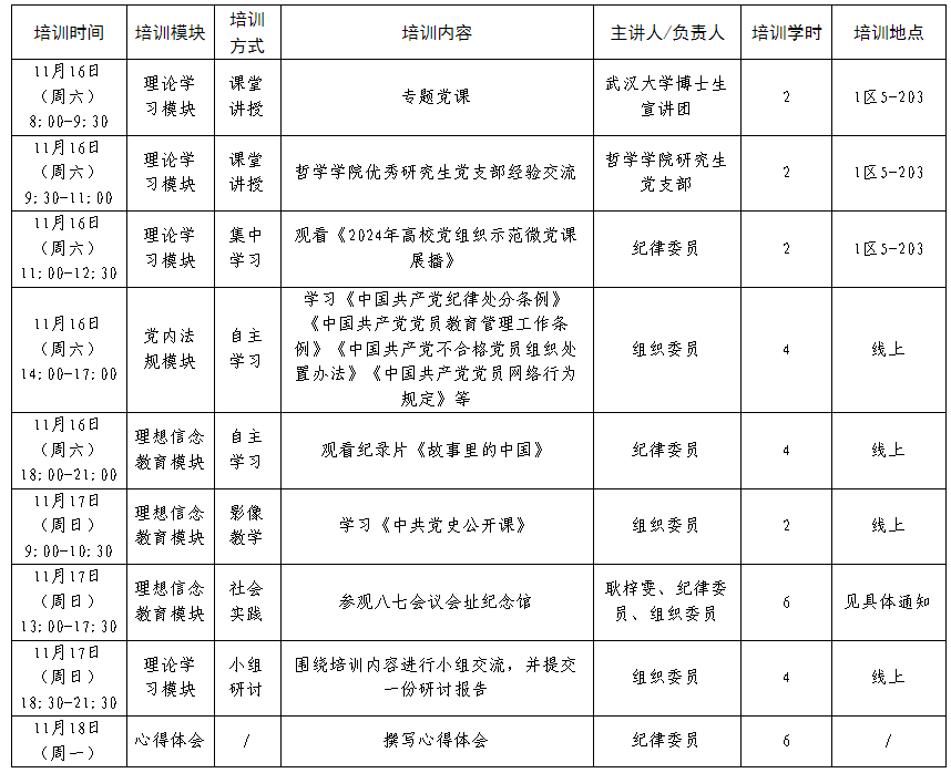 2.加强培训管理。学院党委设立组织委员1名负责协助做好培训班的活动组织,确保活动的有序开展,纪律委员1名负责协助记录,负责协助记录培训班的考勤、心得体会等工作,确保培训效果。