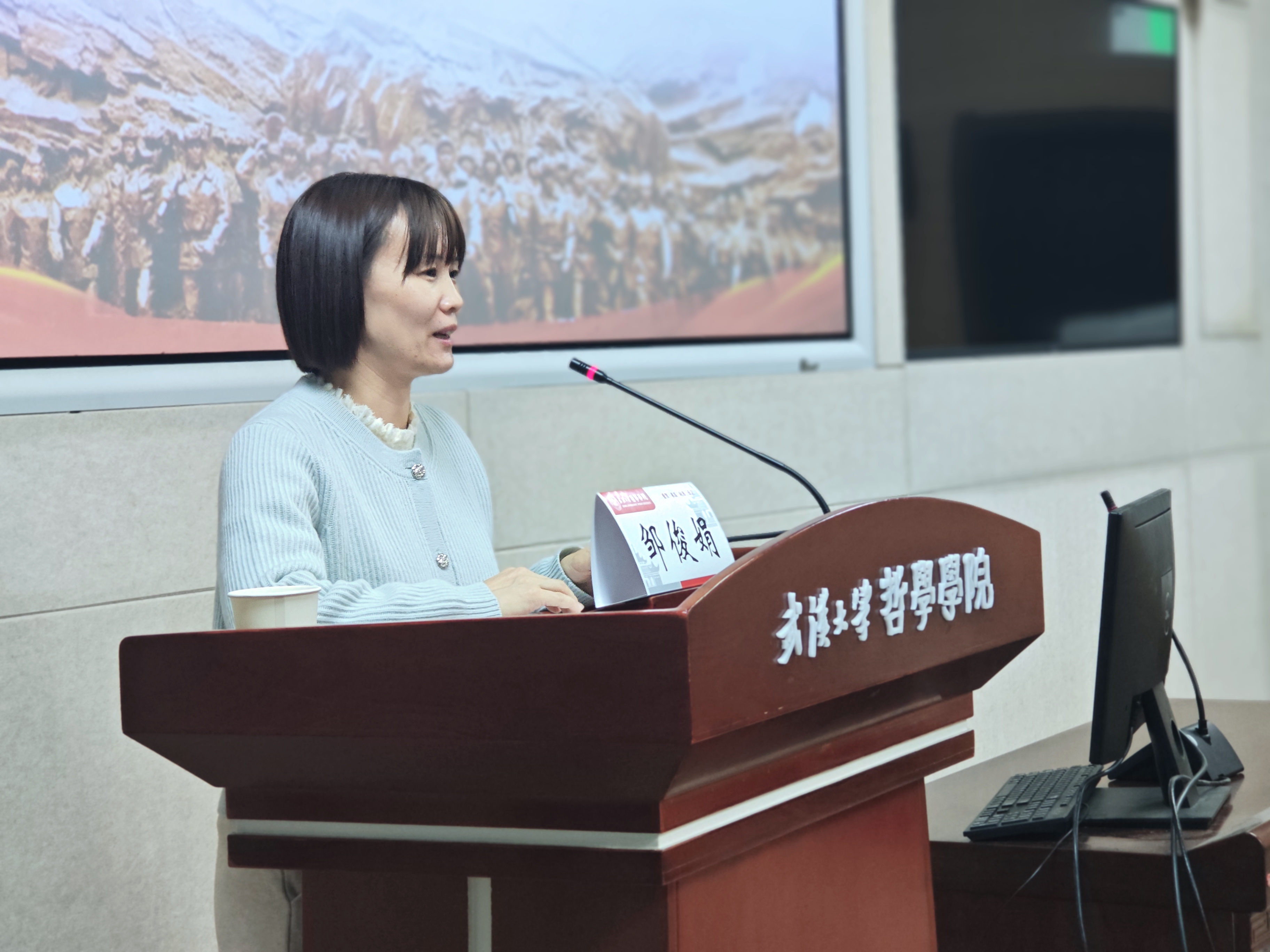本网讯(通讯员何嘉丽 孙上茗)12月13日晚,大庆师范学院马克思主义学院副教授邹俊娟在振华楼B214会议室做题为“我的大庆精神研究”讲座。本讲座由学生工作办公室副主任代丹妮主持。色情导航 党委副书记严璨、李维武教授、何萍教授以及色情导航 研究生会、外国哲学研究生党支部、国学研究生党支部等40余名同学参与本次讲座。