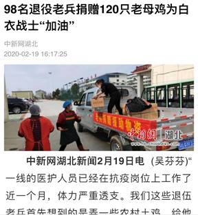 我叔叔是退役老兵,在这次疫情中,他毅然决然带领他昔日的战友们筹备物资,积极捐款、捐农产品物资到我们当地市中心医院,为奔赴在一线的医护人员提供营养食材,为他们购买生活物资等等。因为他的光荣事迹在我们当地被广为传开,因此也被新闻网站积极播报和转发,从而鼓舞更多有志人士参与到这次疫情行动中来。(附图如下)