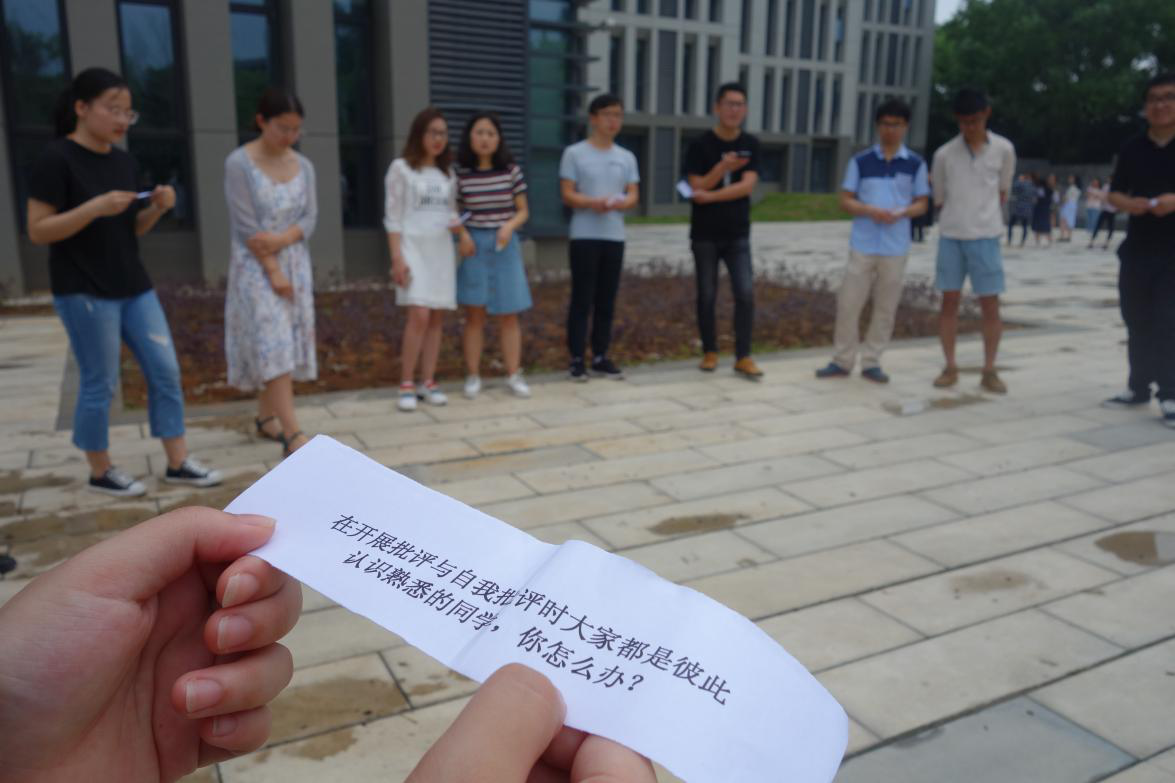 第二个环节进入到“你问我答”。两位助理老师分别给出六个打印好的题目让成员抽取回答。题目内容均为发展对象对党及其时政热点的认识,包括入党动机、党员与群众、递交入党申请书后个人的改变、评判厦大洁洁良事件、批评与自我批评。讨论持续时间长,问题讨论充分全面,涉及学理、社会道德以及个人实践多个层次。