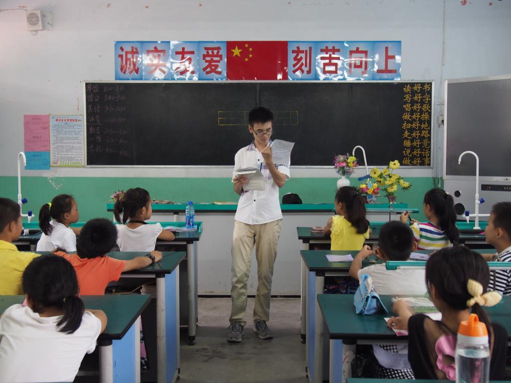 见到孩子们的第一面是在一个燥热下午的“开学典礼”上,我看到所有的孩子站在操场上,当地小学的校长指给我看:“这两排就是你要教的五年级二班的学生。”于是我看到一个个黑黑瘦瘦的小小身影,站在我旁边的另一位支教队员惊讶地说:“五年级的学生个头才这么小?”我心里也很诧异。我领着他们走去教室,他们用好奇的目光打量着我们,一遍悄悄地说着什么,一边偷偷地笑。有几个胆大的学生用方言问我们话,我没听明白,不得不弯腰再问一遍:“你说什么?”然后他们又笑,搞得我丈二和尚摸不着头脑。开学第一课,我让所有人依次到讲台上介绍一下自己,结果所有学生都胆怯到不行,要么吞吞吐吐,要么羞红了脸,有的都不敢站起来,几乎没有人知道该怎么样完成一个合格的自我介绍。于是我教他们,至少要告诉大家自己叫什么名字,今年多大了,家住在哪里,自己的兴趣爱好是什么,等等。结果所有的学生都按这个模板来说,完全体现不出自己的个性。内敛,朴实,顽劣,这是我对这群学生的第一印象。