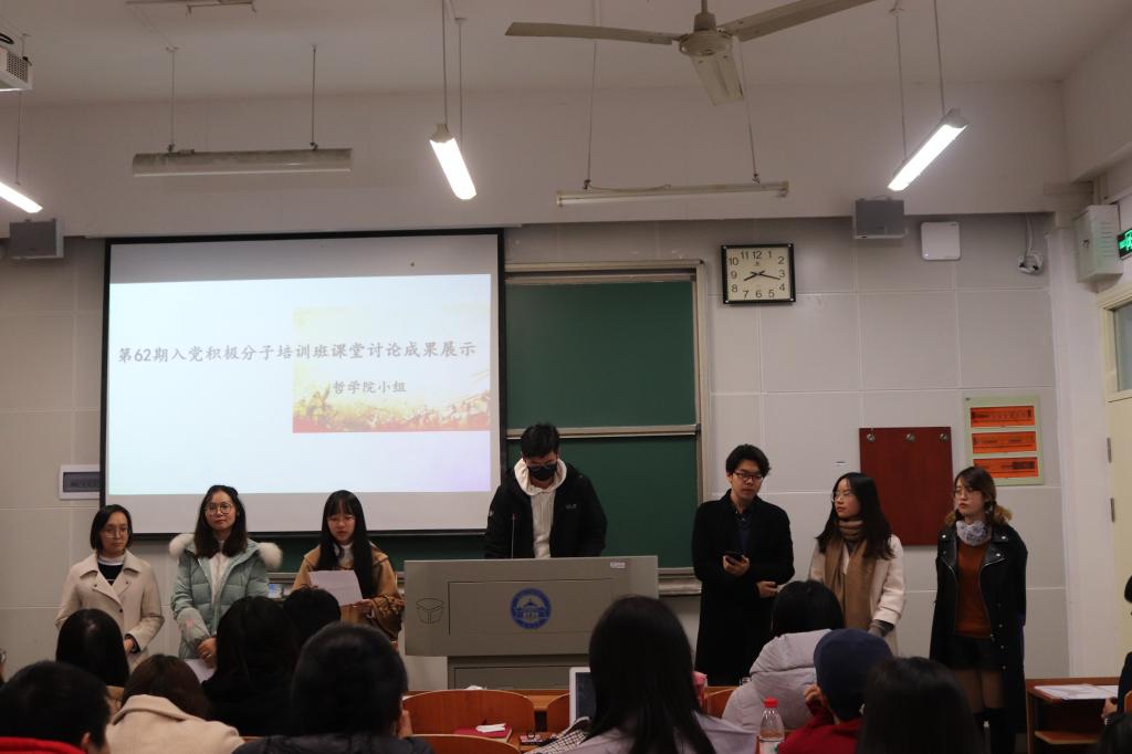 本网讯(通讯员:卞子文)经过前期各小组自行组织的线下讨论,11月18日晚6时30分,第62期学生入党积极分子培训班第一分党校八个小组的同学分别针对培训课程中的某一话题,在教五楼105教室进行了汇报展示。