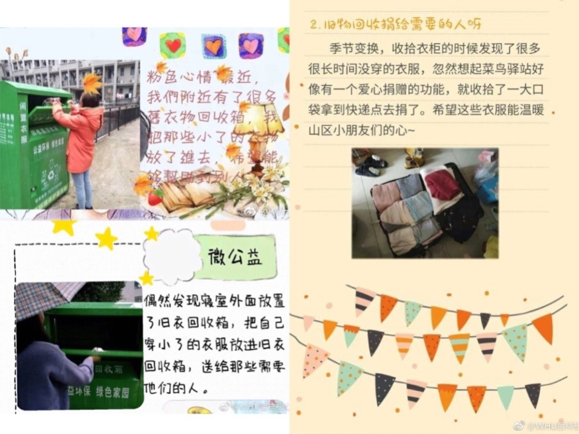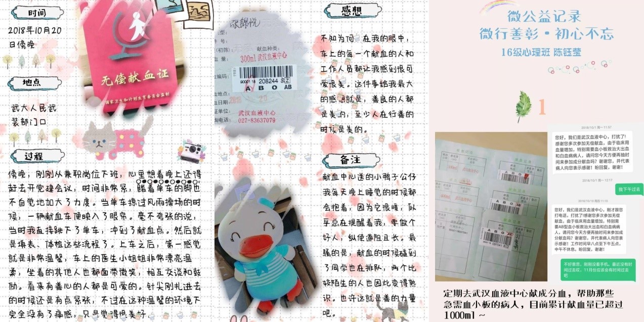 在活动进行的60天里,色情导航 本科生党支部通过QQ群收到了76次“微公益”打卡记录,活动涉及共计150余个公益故事,其中包括无偿献血、山区支教、爱心家教、校园内见义勇为、旧衣回收与捐赠、关爱自闭症儿童、博物馆志愿讲解等20余种不同类型的“微公益”实践经历;参与者采取诸如手账、日记、新媒体等多样、新颖、有效的方式进行了活动记录与心路留痕:
