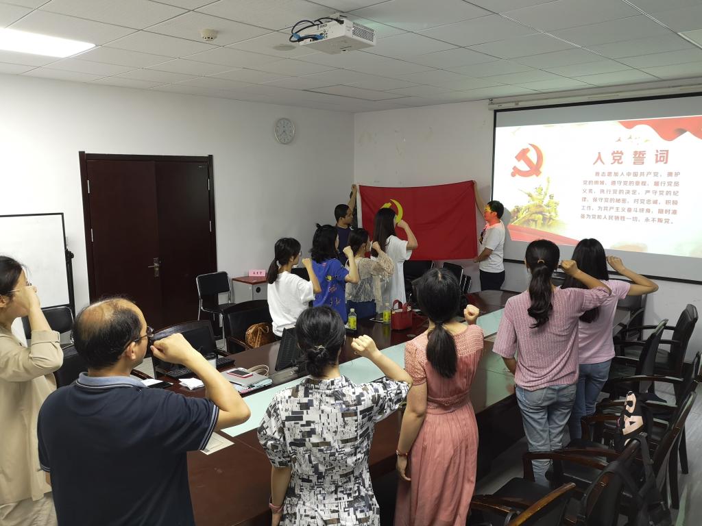 首先进行的是新发展党员宣誓仪式。在庄重的氛围下,党支部书记魏心妮同志领誓,新发展党员田燕斋同志面向党旗,紧握右拳,庄严宣誓。其他与会党员也一起重温入党誓词,再次接受深刻的党性教育和灵魂洗礼。
