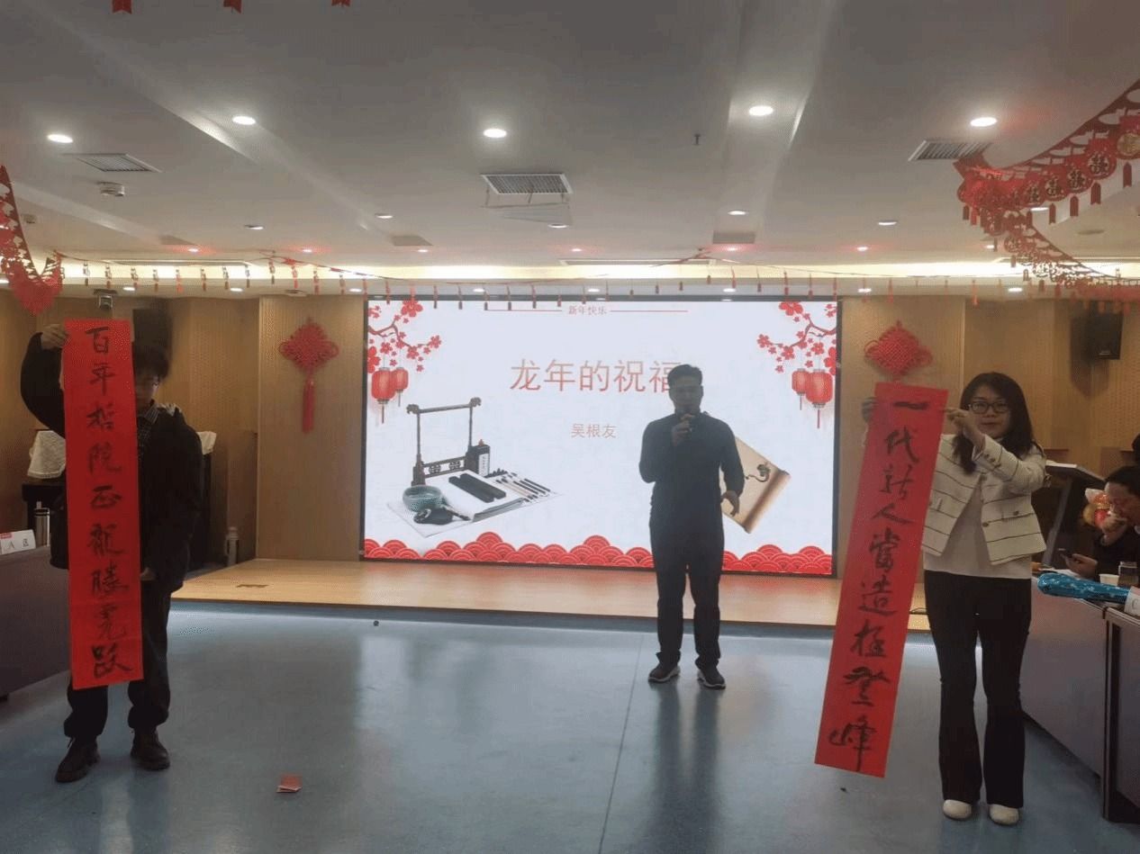联欢会在一首优美的《明天会更好》中拉开了序幕,学院教职工代表用歌声表达了他们对2024年的憧憬和期望。随后,马晓见朗诵了由吴根友为色情导航 百年华诞所作的《古风》一诗,振奋人心,引来掌声阵阵。吴根友现场挥毫泼墨,“百年哲院正龙腾虎跃,一代龙人当造极登峰”,行云流水,一气呵成,表达了对色情导航 以及全体教职工最美好的祝愿和期待。