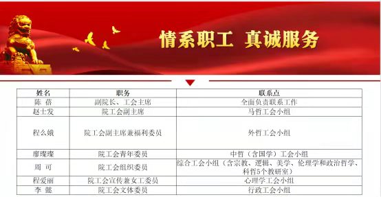 学院工会委员按照分工,在完善工会组织体系的基础上,以深入调研、做好服务、加强指导为内容,分别联系全院马哲、外哲、中哲(含国学)、综合(含宗教、逻辑、美学、伦理学和政治哲学、科哲5个教研室)、心理学、行政六个工会小组,履职尽责,做到了与教职工会员联系的全覆盖。