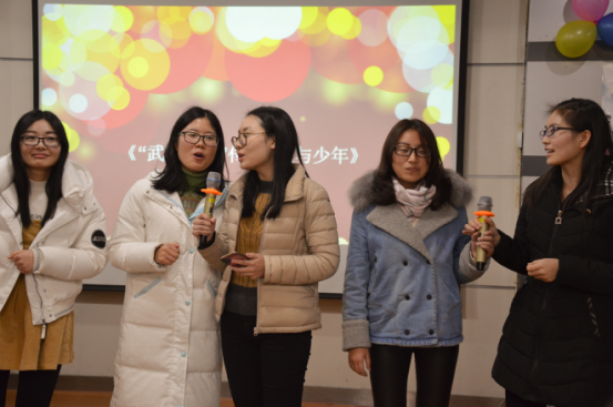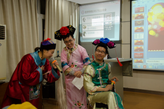 游戏节目穿插在一起,晚会形式丰富。你演我猜的环节,同学们的表现逗得大家捧腹大笑,之后进行的抽奖环节把整个会场再次被推向高潮。接下来的节目既有体育部和学术部共同准备的童趣十足的《儿歌串烧》,也有2015级硕士生带来声情并茂的剧情歌和配音《江湖意》。此前在研究生团体风采大赛中荣获三等奖的《黎明前的暗战——余志宏策反程潜记》剧组,也受邀表演,为同学们生动地演绎了湖南和平解放的英雄。科学哲学、伦理学合出的《外婆的澎湖湾》对唱,既有温情也有笑料。外国哲学的女生为大家带来《武林“外”传——花儿与少年》,饱含深情的合唱引得阵阵掌声。