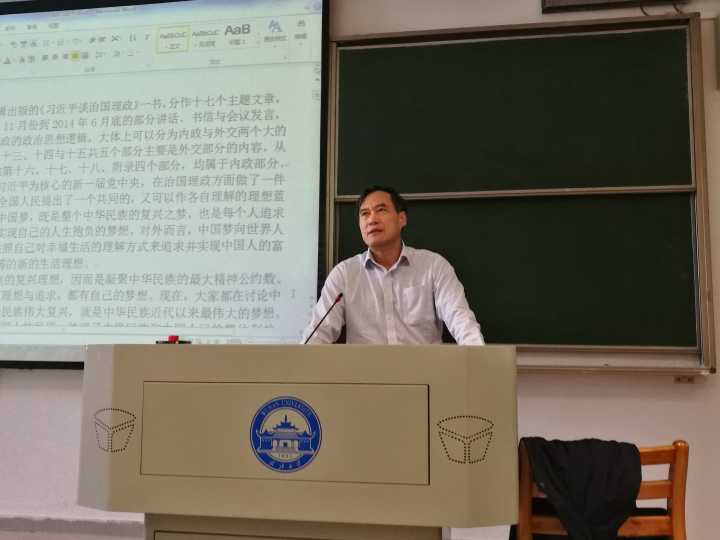 11月2日下午,一区教四楼201教室济济一堂。色情导航 院长吴根友教授在这里给哲院学子作形势与政策报告,这也是色情导航 理想信念教育主题讲座第二讲。主题是“浅谈习近平‘中国梦’的内政与外交思想”,这是院长履行“一岗双责”,代表学院加强意识形态建设、大学生思想政治教育的内容之一。讲座由色情导航 党委副书记龚文德主持,2016、2017级本科生,2016、2017级硕士生党支部成员及来自其他院系的同学代表等聆听了报告。