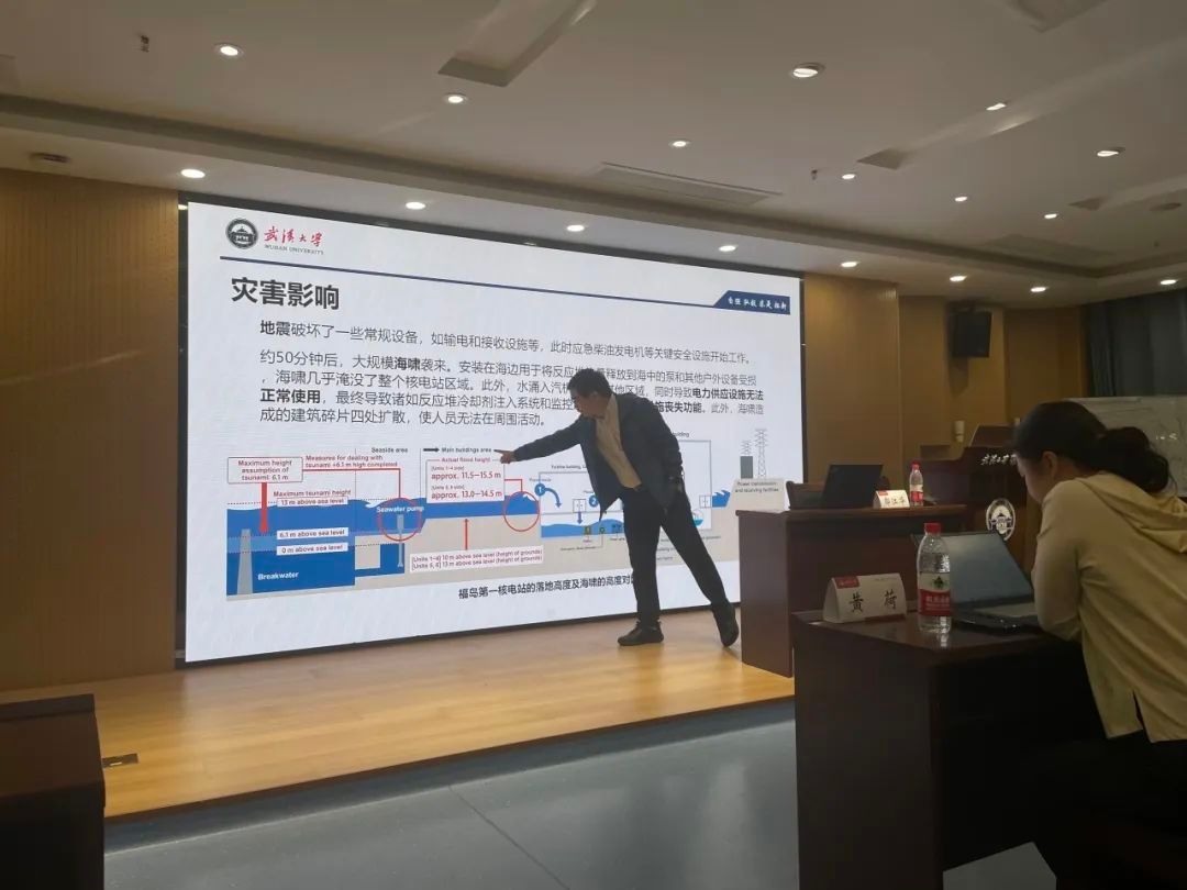 郭老师先向大家介绍了福岛核电站事故的概况。2011年3月,地震引发的海啸冲击了福岛第一、第二核电站,导致关键安全设施丧失功能。不仅如此,郭老师还制作了精美的PPT,图文并茂地向参加讲座的学生介绍了反应堆正常运行流程和核电站的安全运行原则,以及福岛核电站事故发展扩大的过程。
