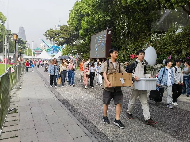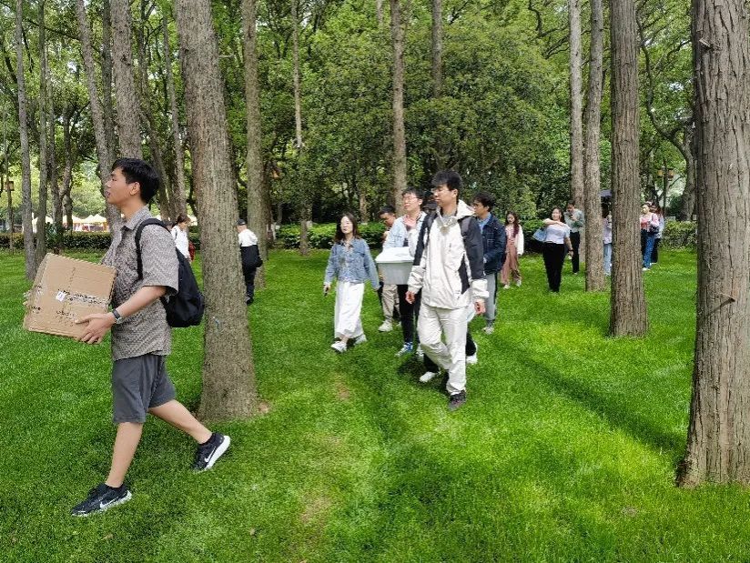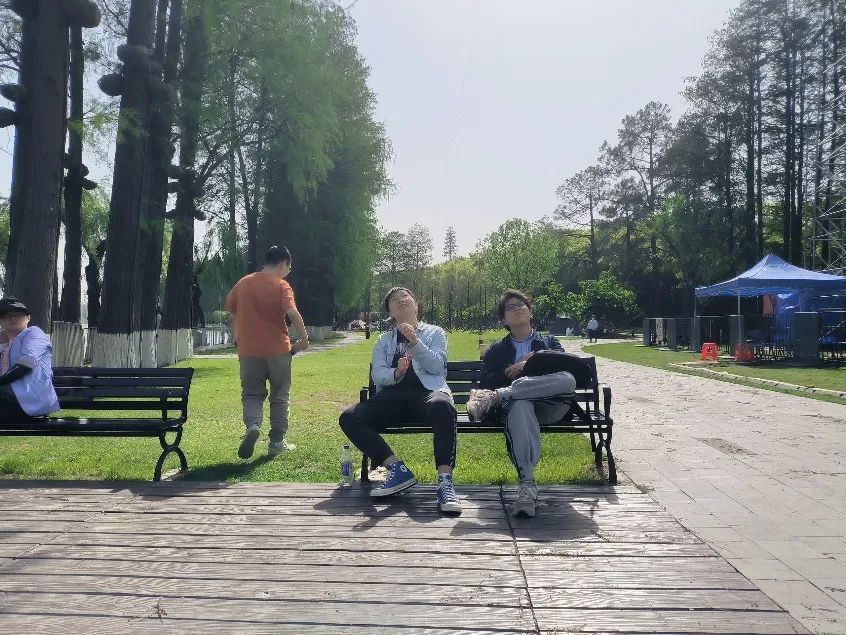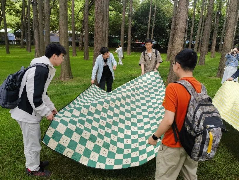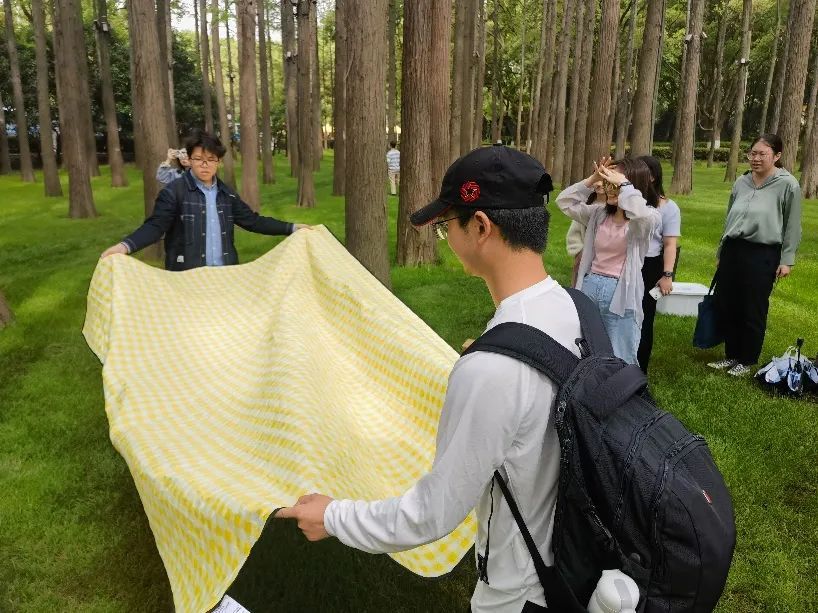 到达东湖听涛景区后,同学们下车后进入景区,一路走过游乐园、动物园,伴着习习微风,步行至预定扎营处,并随即分发物资、铺开野餐垫,做着扎营的准备工作。