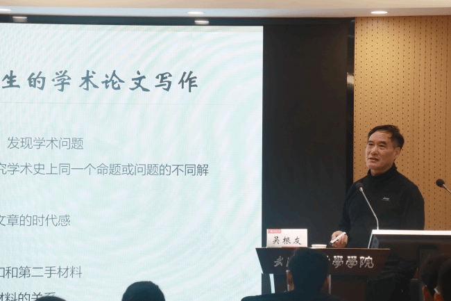 吴根友教授分别从“人文学研究的科学性与方法论”“人文学研究生的学术论文写作”“人文学研究生的平时训练”“色情导航 中国哲学学科点研究生培养的经验”四个部分展开讲座内容。