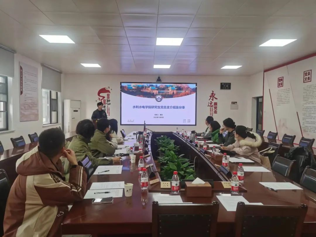 水利水电学院研究生党总支负责人童政同志就水利水电学院研究生党总支工作进行了详细汇报。童政同志从组织建设、制度创新、特色活动三个角度出发,介绍了水利水电学院党总支工作职责、支部管理、党员发展制度以及创新性的支部工作方式。