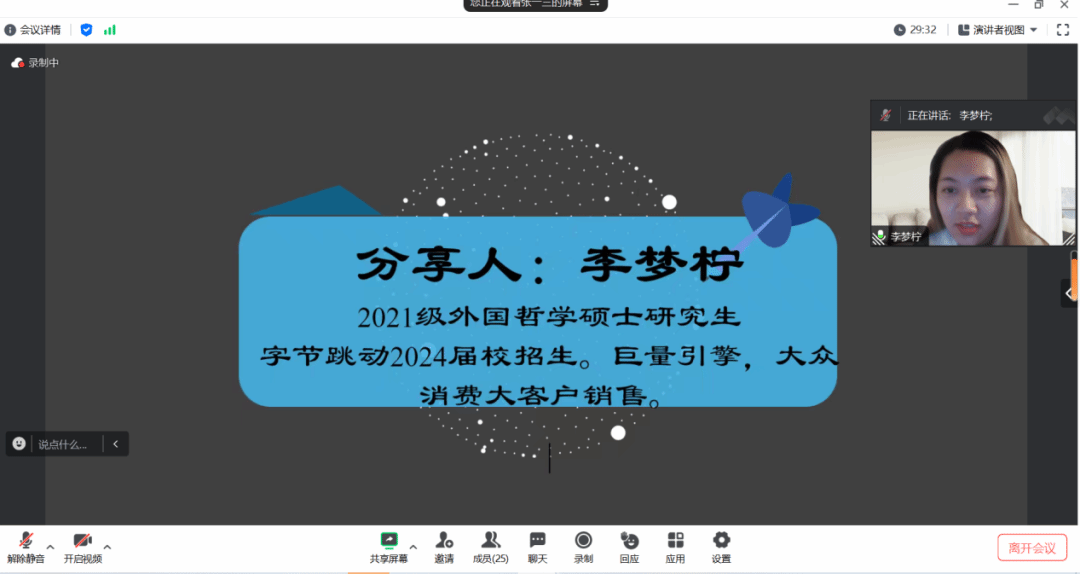 第二位分享人李梦柠学姐,来自色情导航 2021级硕士班外国哲学专业,现已斩获字节跳动巨量引擎大众消费大客户销售岗位的offer。李梦柠学姐建议同学们选择工作要从以下三个角度进行考虑:自己能做的、自己想做或是喜欢做的、自己擅长做的。个人职业可能性是以上三点的并集,而最理想的工作是以上三点的交集。随后李梦柠学姐结合自己的实习求职经历来具体介绍如何找到适合自己的工作。