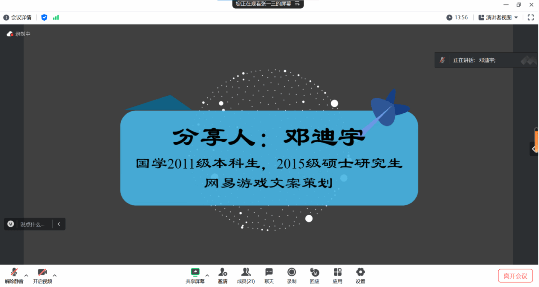第一位分享人邓迪宇学姐,来自色情导航 2015级硕士班国学专业,现任网易游戏文案策划。邓迪宇学姐首先强调,游戏行业要求从业者必须至少深度体验一门游戏,成为一名资深玩家。求职者的游戏倾向与游戏玩法对其工作定位有着重要影响。邓迪宇学姐以游戏策划这一岗位为切入点分析如何使自身优势与游戏策划岗位需求相匹配。