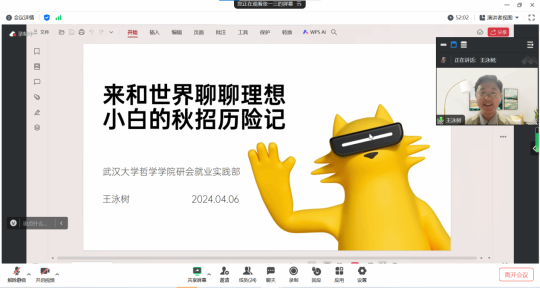 随后王泳树学长建议同学们要破除非科班出身不行的思维障碍,并根据就业市场现状向同学们分享了适合同学们学历背景并拥有较多就业机会的相关行业,拓展了同学们的求职视野。最后,王泳树学长就增加知识储配、提升面试能力、获取实习渠道等方面给出建议。
