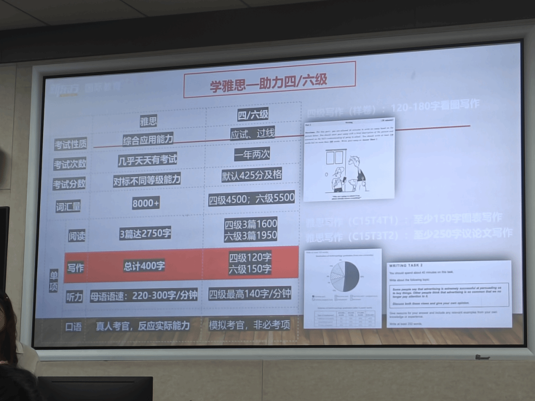 讲座由新东方国际教育集团的资深讲师汤晓青老师执掌讲坛。汤老师首先对雅思(IELTS)考试进行了全面介绍,包括考试的各部分构成及评分标准,使得初次接触雅思的同学们能够有一个整体的认识。