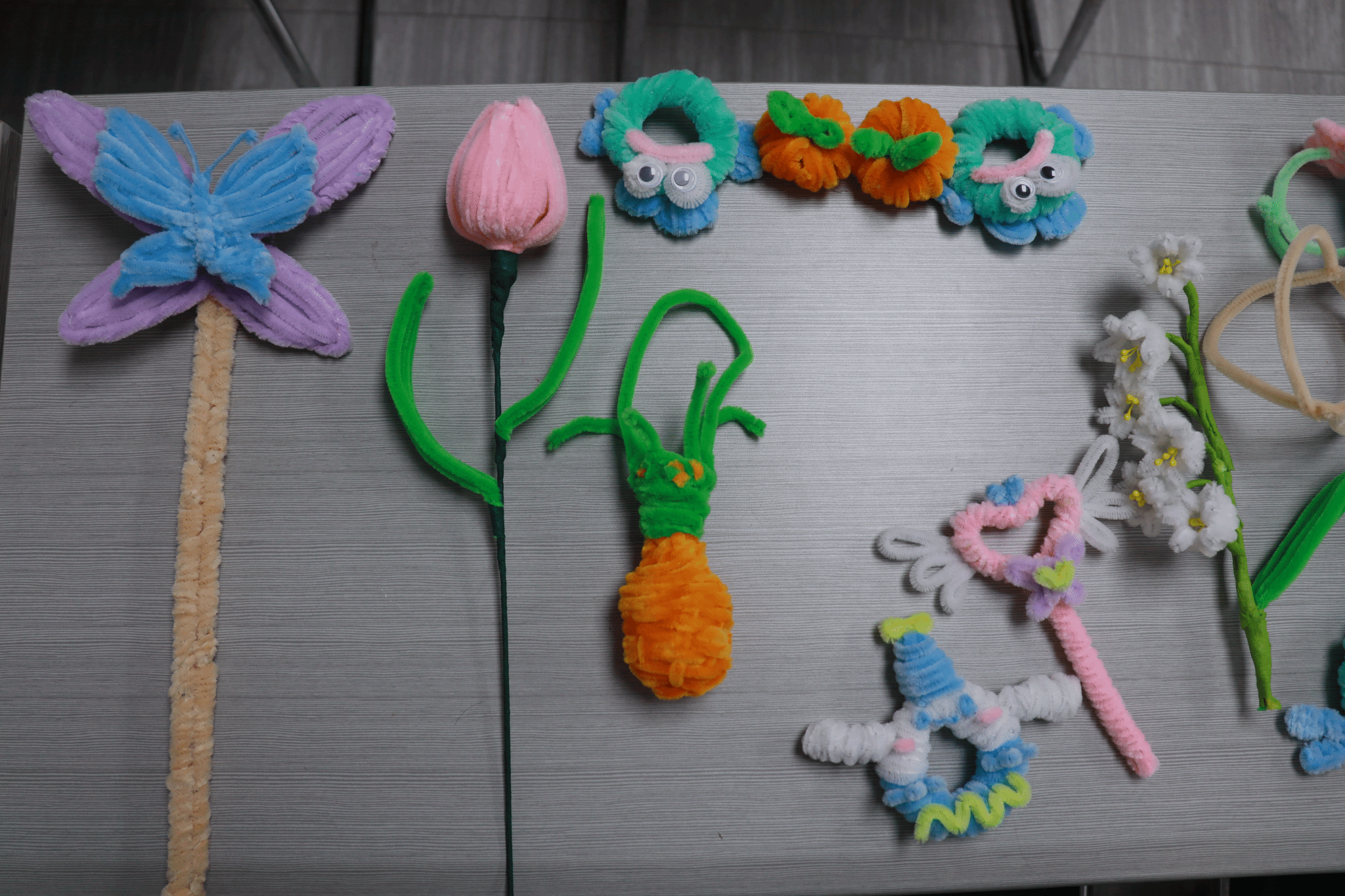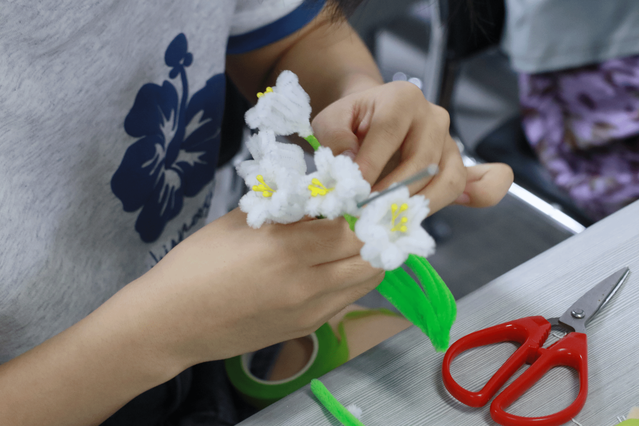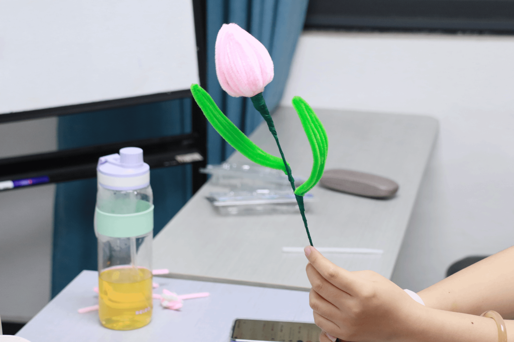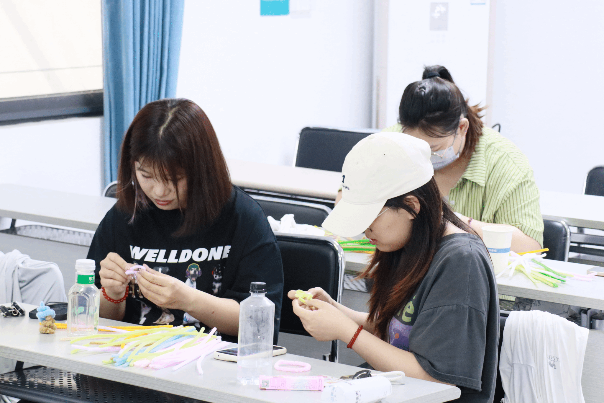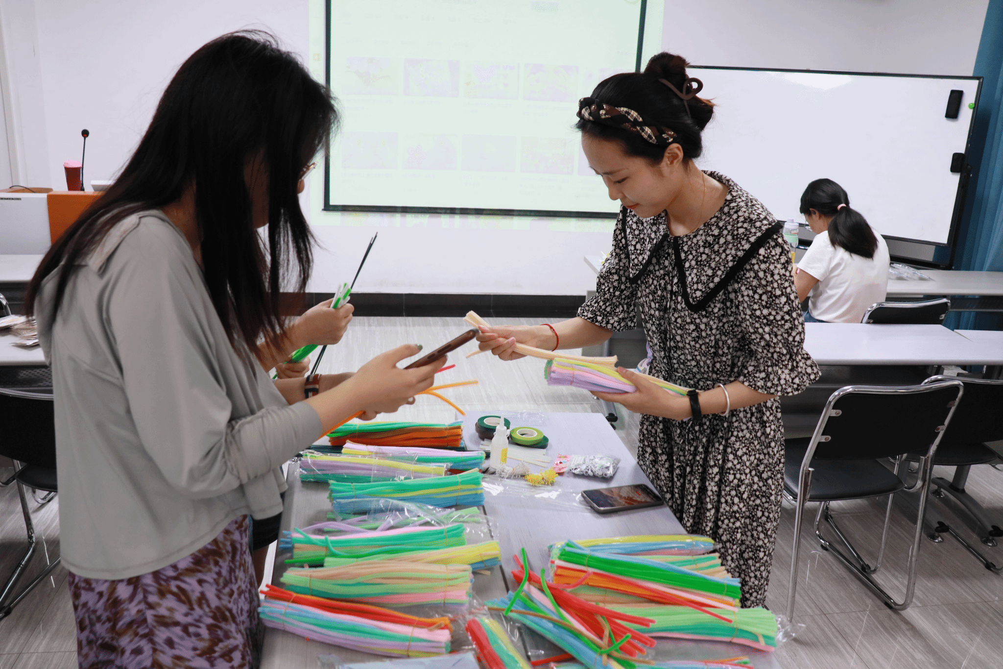 制作讲解结束后,现场迅速进入了紧张而又欢乐的制作环节。同学们纷纷拿起五颜六色的扭扭棒,开始了自己的创作之旅。教室中同学们三三两两地聚在一起,交流着自己的创意和灵感。有人选择制作可爱的饰品,有人决定挑战复杂的花卉,还有人尝试着与众不同的独特设计。桌上堆满了各种材料,剪刀、胶水、扭扭棒,应有尽有,大家热情高涨,兴致勃勃地投入到制作中。