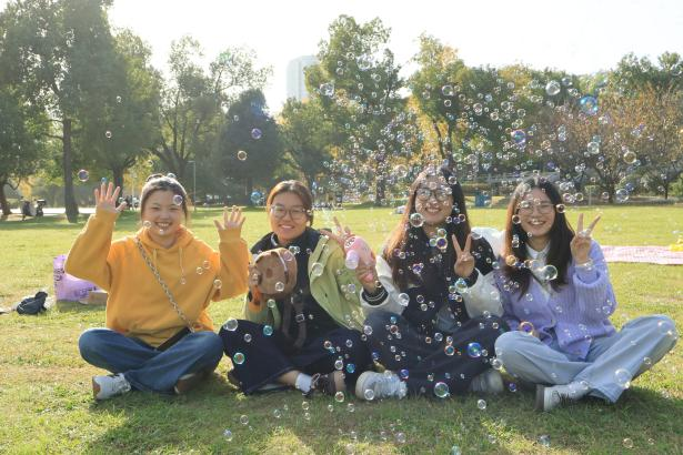 随后,同学们自愿组成三支队伍,分别以“寻觅治愈能量”“发现平常之趣”“捕捉温暖微笑”为主题,在校园内内展开自由创作。银杏金黄、绿草如茵,校园的秋色在镜头下被赋予情感与故事,而并肩行走、共同寻找的过程,也让彼此之间悄然建立起更深的情感连结。一小时后,各组携带作品返回草坪,一场温馨的“草坪光影展”就地展开。微风轻拂,悬挂的照片轻轻摇曳,每一张都在静静诉说。