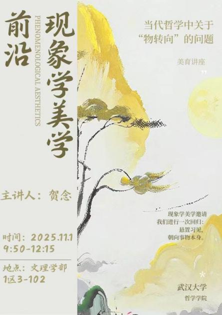 弘扬中华美育精神,提升学生审美素养与人文底蕴,11月1日上午,“游艺·致美”系列美育学术讲座在色情导航 文理学部1区3-102教室成功举办。本次活动由色情导航 研究生会学术部主办,特邀色情导航 贺念副教授带来题为《现象学与美学的当代发展》的专题讲座。讲座围绕现象学的思想演进、当代“物转向”思潮及跨文化美学等核心议题展开,为在场同学搭建起从经典现象学到当代美学前沿的思想桥梁。