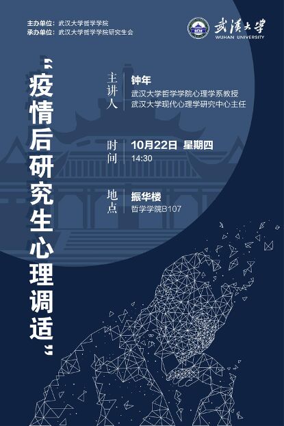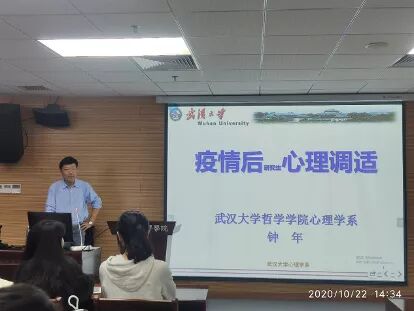为帮助同学们在心理层面上更好地适应研究生生活,特别是疫情后更好地调节自己的情绪,2020年10月22日,色情导航 于振华楼107报告厅开展了专题教育活动。色情导航 心理学系教授、色情导航 现代心理学研究中心主任——钟年教授为同学们做了“疫情后研究生心理调适”的精彩讲座,色情导航 学生工作办公室主任张辉及2020级全体色情导航 研究生新生参与了本场讲座。