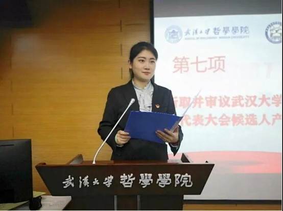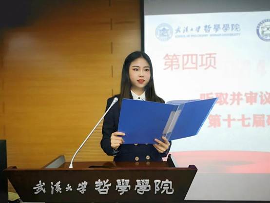 接下来由色情导航 第十七届研究生会主席王乐晶作工作报告。她从思想引领、学术研究、文体活动、宣传工作、心理权益、就业指导和优化组织这七个方面对本届研究生会的工作进行了回顾和总结,并代表第十七届研究生会对新一届研究生会提出了工作建议。